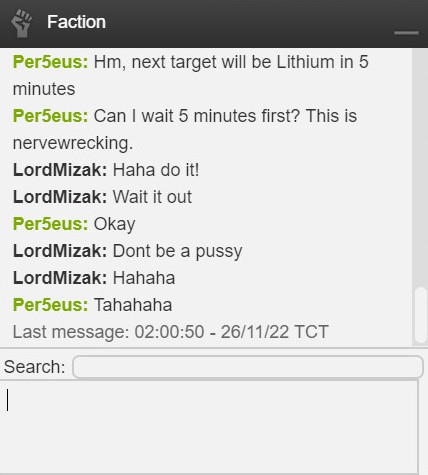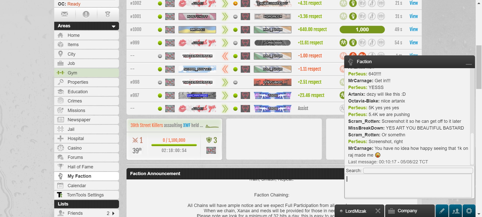 Back to talking about Mizak. Though we created our accounts at approximately the same time, my yearlong break put me significantly behind him. He became my mentor, teaching me about different aspects of the game while continuing to be my exclusive buyer. At the time, I joined a massive warring faction and met lots of great people, including Jynnx, who was my faction leader and is now a notable member in the Torn community. Eventually, Mizak invited me to serve in his faction. I joined him and became part of a small family.