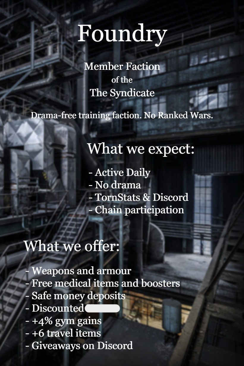 In Torn, a faction is a group of people with common interests. Beginners may join a faction for protection from muggers, as members in a faction often fight on each other's behalf. Players looking for money may join warring factions that pair up against other warring factions and fight for a paycheck. Think of warring in Torn like sports. Two warring factions, or two sport teams, get matched up based on their rank (Bronze, Silver, Gold, Platinum). Throughout the next several hours or several days, the factions will relentlessly attack their opponents to gain points. Whichever faction that holds a specific lead in points wins, and both sides will receive a payout depending on performance (the winner gets better rewards). In my experience, wars can take somewhere between 9 hours to 3 days. The latter is obviously very tiring.